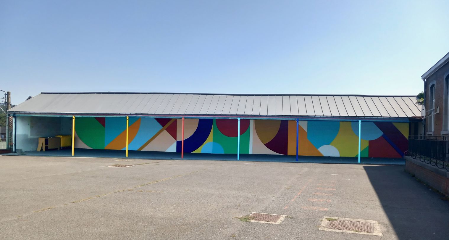 La demande était claire : apporter de la couleur et du dynamisme à la cour de récréation, sans représenter de décor figuratif. Les enseignants souhaitaient une peinture murale abstraite, graphique et contemporaine, reposant sur un jeu de formes et de couleurs, afin de stimuler visuellement les enfants sans imposer de lecture ni de thème précis.