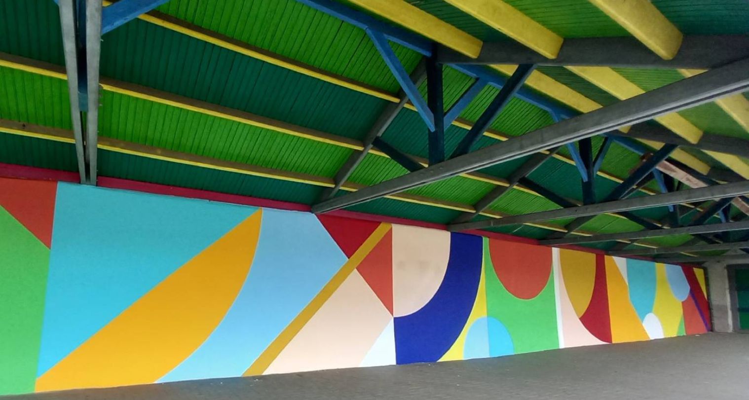 Enfin, dans un souci de cohérence esthétique, les poteaux métalliques soutenant le préau ont été traités avec une peinture anti-rouille, puis mis en couleur dans des teintes en harmonie avec la fresque. Les boiseries existantes n’ont, quant à elles, pas été repeintes, afin de préserver une continuité visuelle avec la toiture.