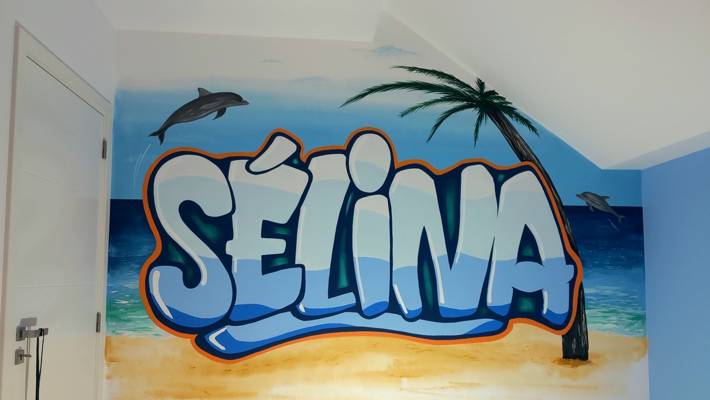 Autour du lettrage, des éléments décoratifs ont été intégrés avec subtilité. La thématique souhaitée par l’adolescente, les dauphins, a été traitée de manière discrète et placée en arrière-plan, sur une surface volontairement limitée d’environ 30 à 40 cm. Cette approche permet d’éviter une décoration trop marquée ou enfantine, tout en faisant le lien avec sa passion actuelle.